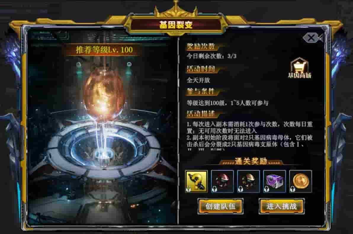 清剿2只母体及4次裂变怪物(共62只),击杀得基因积分,限时全清解锁珍稀奖励。